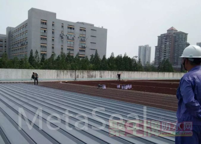 上图:屋面上所有搭接缝做美莎防水加固,然后再整体喷涂美莎保护涂料。