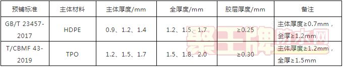 预铺防水卷材执行的标准有国标GB/T 23457-2017、团标T/CBMF 43-2019以及企标等,这里我简单给大家介绍下这两种高分子类预铺防水卷材(HDPE预铺防水卷材和TPO预铺防水卷材)国标和团标的不同点,主要从适用范围、定义、规格厚度、物理性能指标、手感五个方面进区分对比。