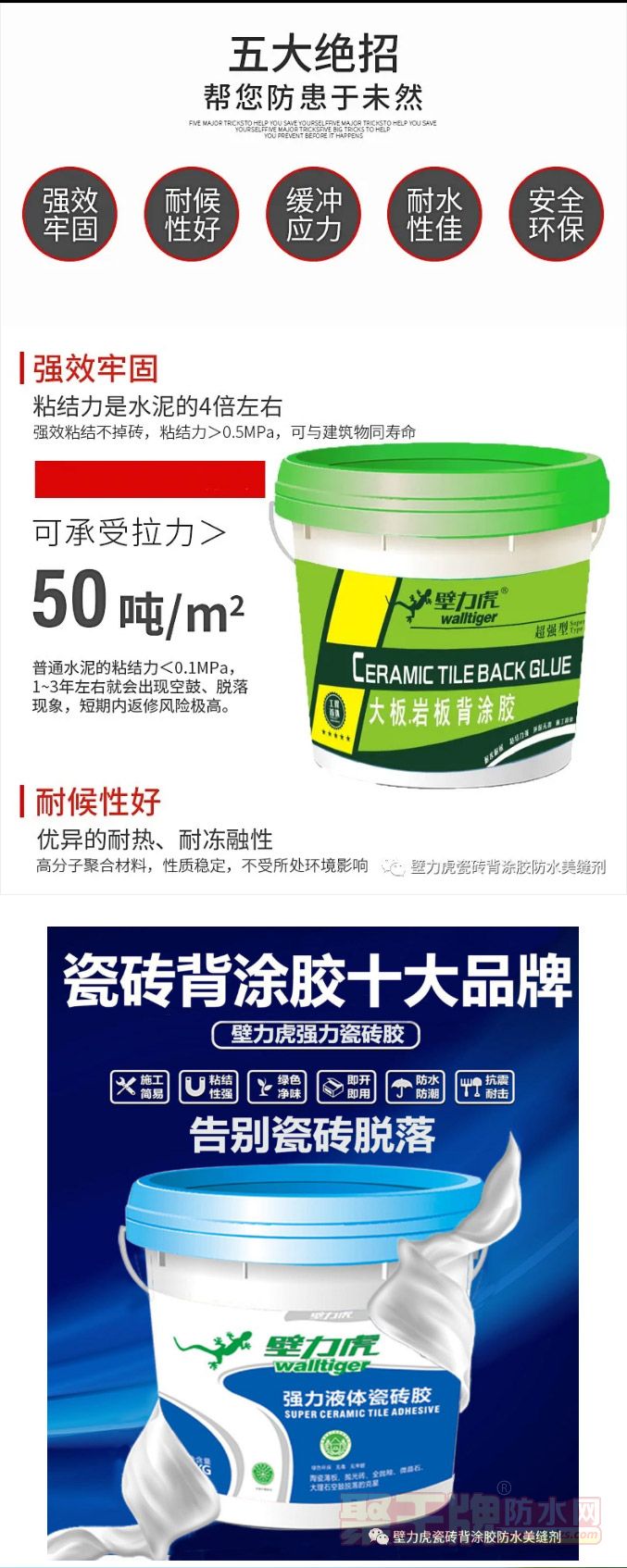 壁力虎推出了环保型家装K11防水系列、强力瓷砖粘结剂背涂胶产品系列、卫浴间回填宝产品系列、环保型SBS液体卷材防水,金属防水,反射隔热防水,外墙透明防水,墙固地固系列,固沙宝返沙克星产品,美缝剂,晶瓷胶,填缝剂,以及免砸砖堵漏剂等极富竞争力的系列产品,成为了装修辅料领域的领**和风向标,并因此成为了中国瓷砖胶,防水行业**品牌。