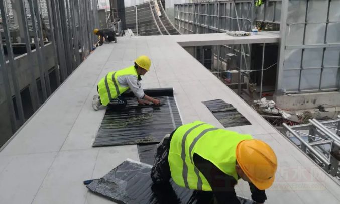 大面积涂刷橡皮金自能长效防水膏同时铺贴抗撕裂布。