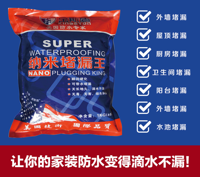 金斯盾纳米堵漏王是一种新型的高效无机防潮、抗渗、堵漏材料和极好的粘结材料,分为速凝堵漏型和缓凝.抗渗型两种,均为单 组分灰黑色粉料。 速凝.堵漏型:用于抗渗、堵漏,紧急抢修。 缓凝.抗渗型:用于防潮、抗渗,大面积防水。 |