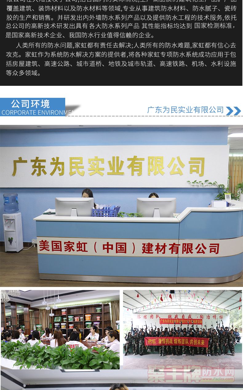 广州为民建材有限公司是美国家虹(中国)建材企业集团在中国大陆生产及经营建筑用化学材料产品的大型企业。随着中国经济迅猛发展,家虹为满足建筑材料需求的快速增长,于2009年在大陆建立生产基地并授权广州家虹化工科技有限公司拓展中国市场,按照总公司严格的技术规范、品质管制及化学和混凝土实验室数据生产适应中国复杂多变气候环境且处于国际*先地位的家虹化工建材系列产品。并且为顾客提供必需的测试及完美的防水系统解决方案,作为全球化工建材领域的著名品牌,家虹一直以优质的产品及优良的服务,加上公司不断的研究、产品创新来保证将来中国市场发展需求。