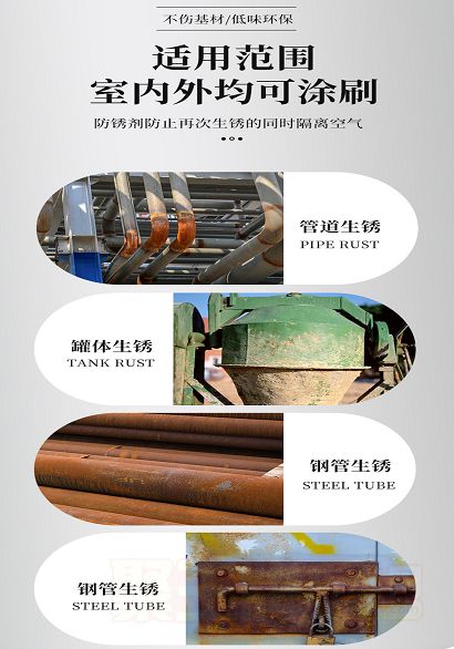 本品适用于已产生锈蚀的钢铁件的防腐处理。广泛用于钢结构、厂房、隧道、桥梁、城建设施、高速公路设施、铁路设施、船舶、码头港机设施、石油设施、冶金及化工等设备的制造和维修,可用于涂装前的去锈防锈底漆处理;也可单独作为去锈防锈漆使用。
