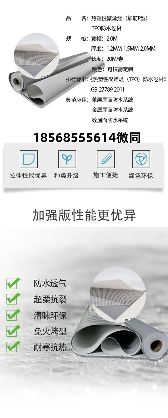 用聚酯或玻纤网格布在卷材中间加筋的热塑性聚烯烃防水卷材