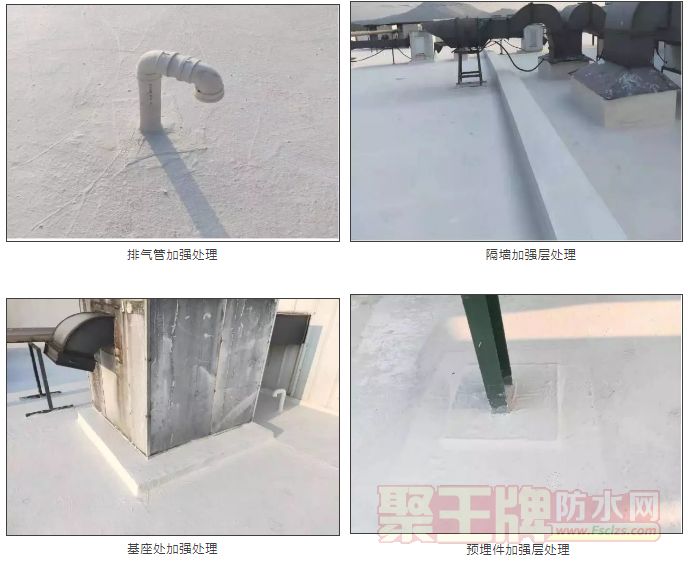 包括设备基础、管道支架、风管洞口、落水管、管道周边、沉降缝、挡水线及各类墙角转角处等,应有必要的混凝土包裹、密封或砌筑挡水和防水附加层等处理措施,防水上翻高度不低于300mm女儿墙体满做,局部节点加强处理要求。