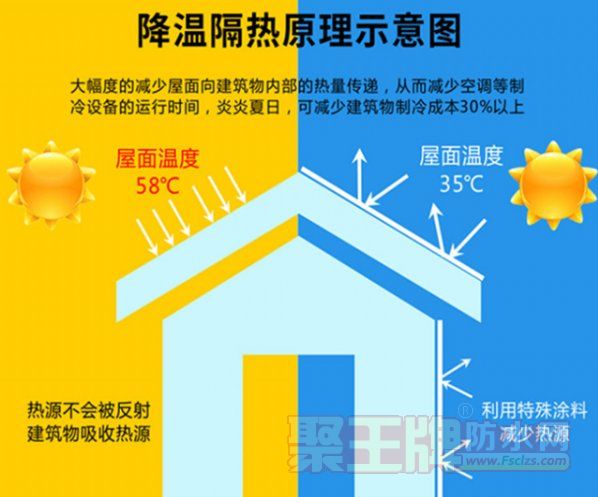 降温明显·耐候性好·防水性强·防腐性好·附着力强·施工简单环保无味·自洁功能一、产品介绍本产品采用进口的隔热反射原料和高分子聚合物乳液经过自交联化学反应精制而成。涂料成膜后,隔热反射效率高,涂层具有耐水、耐候、耐污等特点。能有效降低屋面表面温度,适用于各类防水节能建筑工程中,是集防水、隔热、反射为一体的新型材料。