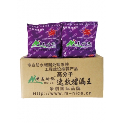 **-55快速堵漏王快速堵漏王(FastLeak-stoppingAgent)是美耐施的全新一代技术产品。其特点是凝结硬化快,初终凝时间间隔极短,终凝后迅速产生强度,15分钟强度大于10MPa,1小时强度大于20MPa。可带水作业,并迅速止水、堵漏。该产品施工简单,与基层粘结力强,不收缩、不脱落,可广泛应用于房屋、地下、水下、隧道等建筑工程的堵漏止水、抢修、灌注等。该产品无氯、无毒,不燃不爆。产品技术指标高于JC900-2002《无机防水堵漏材料》国家标准.