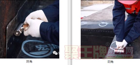 如阴阳角部位,在施工前要抹成圆弧形或45度坡角,然后裁剪卷材,做支撑角,然后进行加强处理。