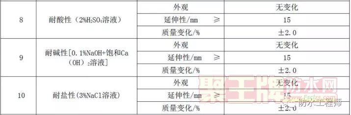 耐酸性、耐碱性、耐盐性:耐酸、碱、盐性反映了材料的抗腐蚀效果,通过外观、延伸性和质量变化来表示,标准要求如下: