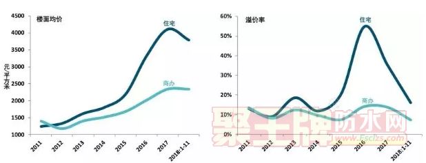 图:2011-2018年11月全国300个城市住宅和商办用地成交楼面价及平均溢价率
