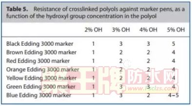 通过文章的报道,该反应确实可以让多元醇交联;其次,交联键是脲键而不是氨基甲酸酯键,与仅含有聚氨酯键的膜相比,所得到的膜变得更具极性。反过来,可以解释为什么咖啡抗性不会随着交联程度的增加而改善。最后,由于代替一个异氰酸酯基团,在水解时需要两个异氰酸酯基团形成交联键,因此异氰酸酯基团并没有高效的应用,在实践中,通常配制NCO:OH比率高于1的含多元醇来解决。