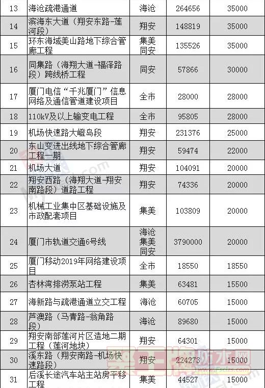 近期,厦门市2019年重点项目名单公布,共357个,项目总投资8885.1亿元,年度计划投资1192.6亿元。其中,城乡基础建设项目94个,总投资3053.34亿元,年计划投资342亿元,具体如下: