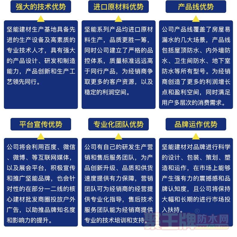 加盟坚能建材,共享未来财富,坚能彩色厨卫王 坚能瓷砖背胶 坚能防水胶带都是目前市主流产品,市场潜力巨大,欢迎来电咨询了解加盟细节。