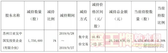 公告显示,9月30日,持有建研院股份5,880,000股(占公司总股本比例3.36%)的股东日亚吴中国发计划以集中竞价、大宗交易、协议转让方式减持公司股份不超过5,880,000股(占公司总股本的3.36%)。日亚吴中国发的减持计划公告于2019年6月28日开始,2019年12月26日结束。截至2019年9月27日,减持计划时间过半,减持价格为10.80-12.35元/股,日亚吴中国发已减持1,750,600股,占建研院总股本1%,减持计划尚未实施完毕。2019年9月27日,日亚吴中国发持有建研院股份4,129,400股,占建研院股份总数的2.36%。建研院股东日亚吴中国发不是建研院控股股东、实际控制人,减持计划实施不会导致建研院控制权发生变化,亦不影响建研院的治理结构和正常经营。