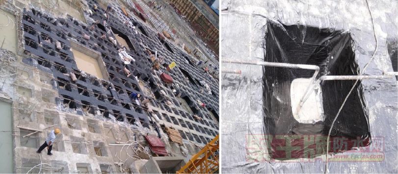 2、预铺反粘 ——将附有高分子自粘胶膜层的防水卷材空铺在基面上,然后浇筑结构混凝土,使混凝土浆料与卷材自粘胶膜层紧密结合的施工方法。
