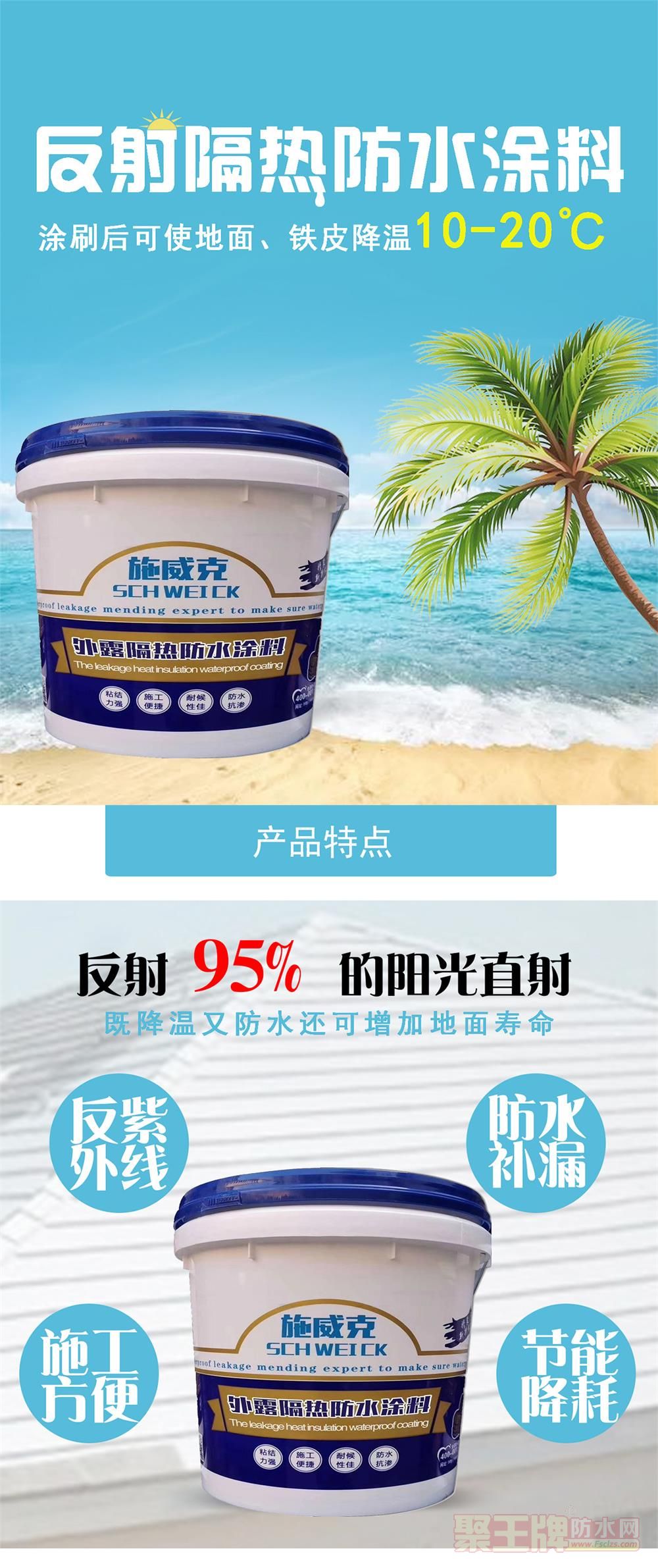 施威克外露型隔热防水涂料,为单组分隔热防水浆料,是由公司自主研发的一种新型涂料,具有独特隔热性、防水性、高弹性和整体性,涂膜连续无任何接缝;且涂料施工便捷。材料中添加国外进口聚乳液及多种特殊材料调制而成的新型隔热防水涂料。该涂料能把太阳辐射中的紫外线及红外线反射并阻截热能传导,辐射绝热达R-20级,传导绝热达R-5级,具有隔热、降温、防水、隔音、美化多重功效,不含毒性、无放射性等。
