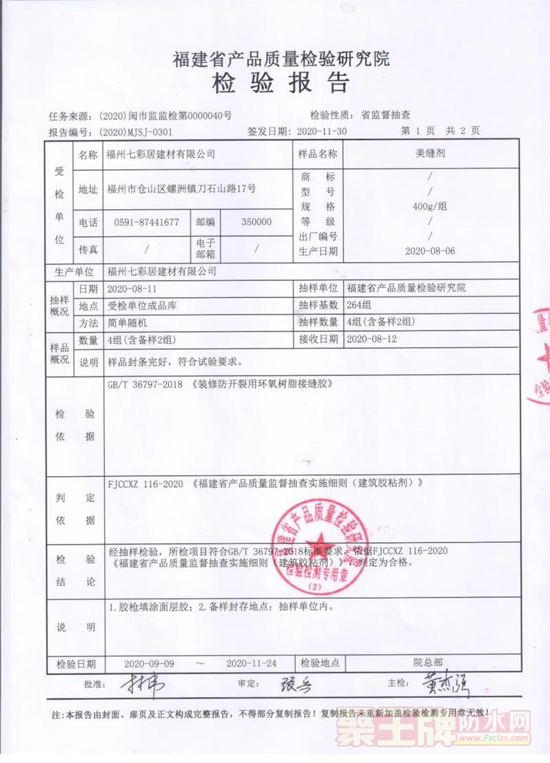 我司自08年成立以来,产品荣获中国环保产品认证、国家发明专利,企业通过IS09001-2018国际质量管理体系认证,继参DB35/T1668-2017《室内装饰装修用环氧树脂嵌缝剂》地方标准后,再度参编GB/T 36797-2018《装修防开裂用环氧树脂接缝胶》。公司长期坚持落实“科学管理,技术创新,产品优质,客户满意”的质量方针,严格加强内部质量管理,并确保质量目标“产品质量满意率100%,服务质量满意率100%”,产品每年都通过国家质量监督检查。本次特工组无溶剂型美缝剂再次通过省监督抽查(2020)闽市监监检第0000040号抽样检测合格,预料之中,可喜可贺!
