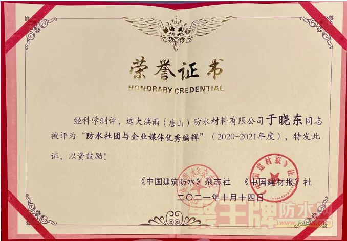 另外,远大洪雨市场管理中心于晓东被评为“防水社团与企业媒体优秀编辑”。