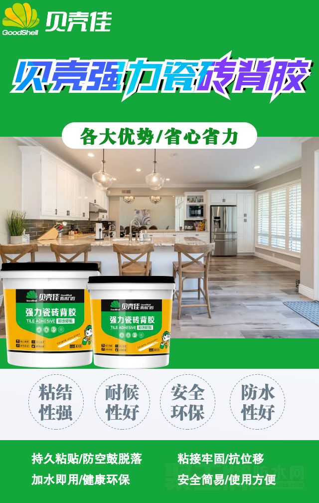 贝壳瓷砖背胶是由高分子聚合物与无机硅酸盐复合而成的产品,可与多种粘结材料配合使用,在标准混凝土板和釉面砖上有良好表现,使用安全。