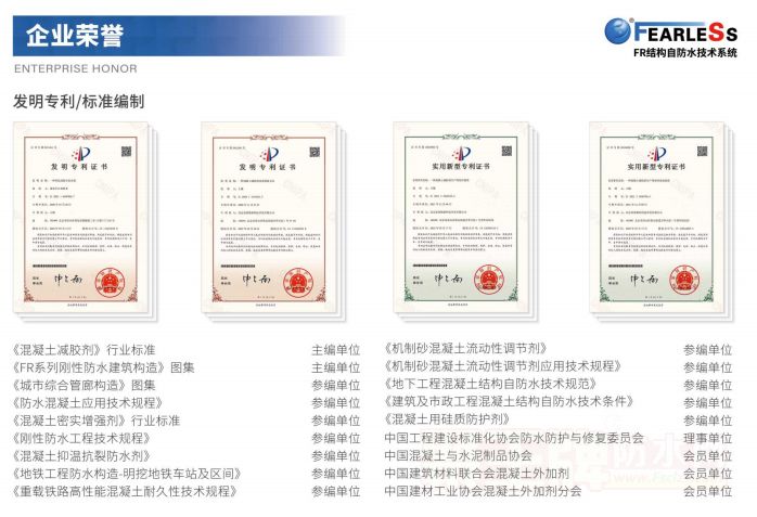 公司以“载营魄抱一”的经营理念为市场发展根基,以“FEARLESS (勇往直前) "的开拓精神为企业推进器,全力推进“FR结构自防水技术系统”在市场的运营。先后受邀参加《FR系列刚性防水建筑构造》、《刚性防水工程技术规程》 、《城市综合 管廊工程防水构造》、《地铁工程防水构造 明挖地铁车站及区间》等多项**级规范的编制工作。