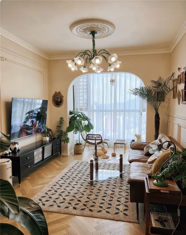 颇具东南亚风格的圆栱门打通了客厅与阳台