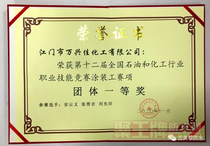 吉美帮自创立伊始,不断加大对产品的研发创新,对防水工艺的改进及培训;通过对产品的反复实操,来增强对产品的了解度,熟悉度,进而达到对产品性能的深入理解。为了检验自己,同时与行业进行更深入交流,吉美帮参加了由涂料行业协会和涂料企业共同在佛山潭州国际会展中心举办的2020年“全国石油和化工行业职业技能竞赛”,熟练的操作工艺,亲密无间的团队合作,经过两天激烈的角逐,吉美帮团队得到了组委会的一致认可,并且取得了涂装工赛项的团体一等奖的好成绩。