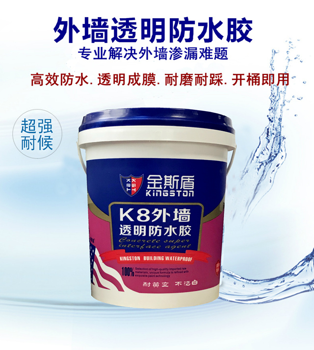 金斯盾外墙透明防水胶采用特种高分子共聚物为基料,经多种改性助剂研制而成的新型防水涂膜胶(透明)本产品具有优异的常温 断裂延伸率和低温延伸率,优异的耐人工气候老化性。特别是在有酸性雨和沿海地区,可有阻隔雨水渗入及停留的作用,具有 优异的抗渗、防水功能。
