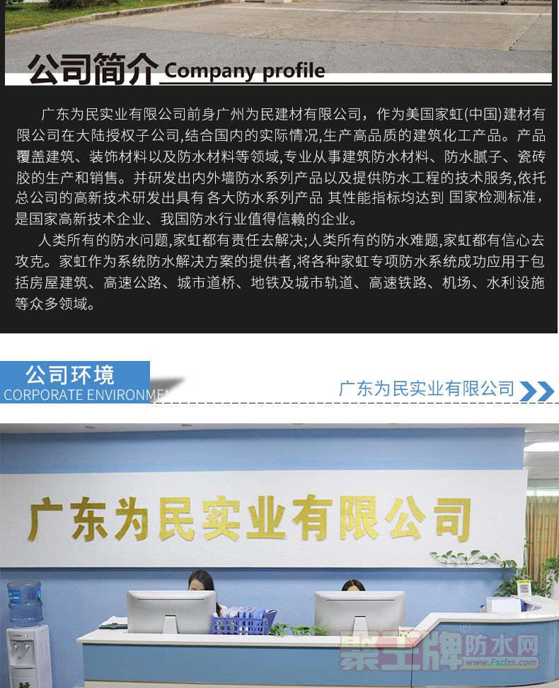 广州为民建材有限公司是美国家虹(中国)建材企业集团在中国大陆生产及经营建筑用化学材料产品的大型企业。随着中国经济迅猛发展,家虹为满足建筑材料需求的快速增长,于2009年在大陆建立生产基地并授权广州家虹化工科技有限公司拓展中国市场,按照总公司严格的技术规范、品质管制及化学和混凝土实验室数据生产适应中国复杂多变气候环境且处于国际*先地位的家虹化工建材系列产品。并且为顾客提供必需的测试及完美的防水系统解决方案,作为全球化工建材领域的著名品牌,家虹一直以优质的产品及优良的服务,加上公司不断的研究、产品创新来保证将来中国市场发展需求。