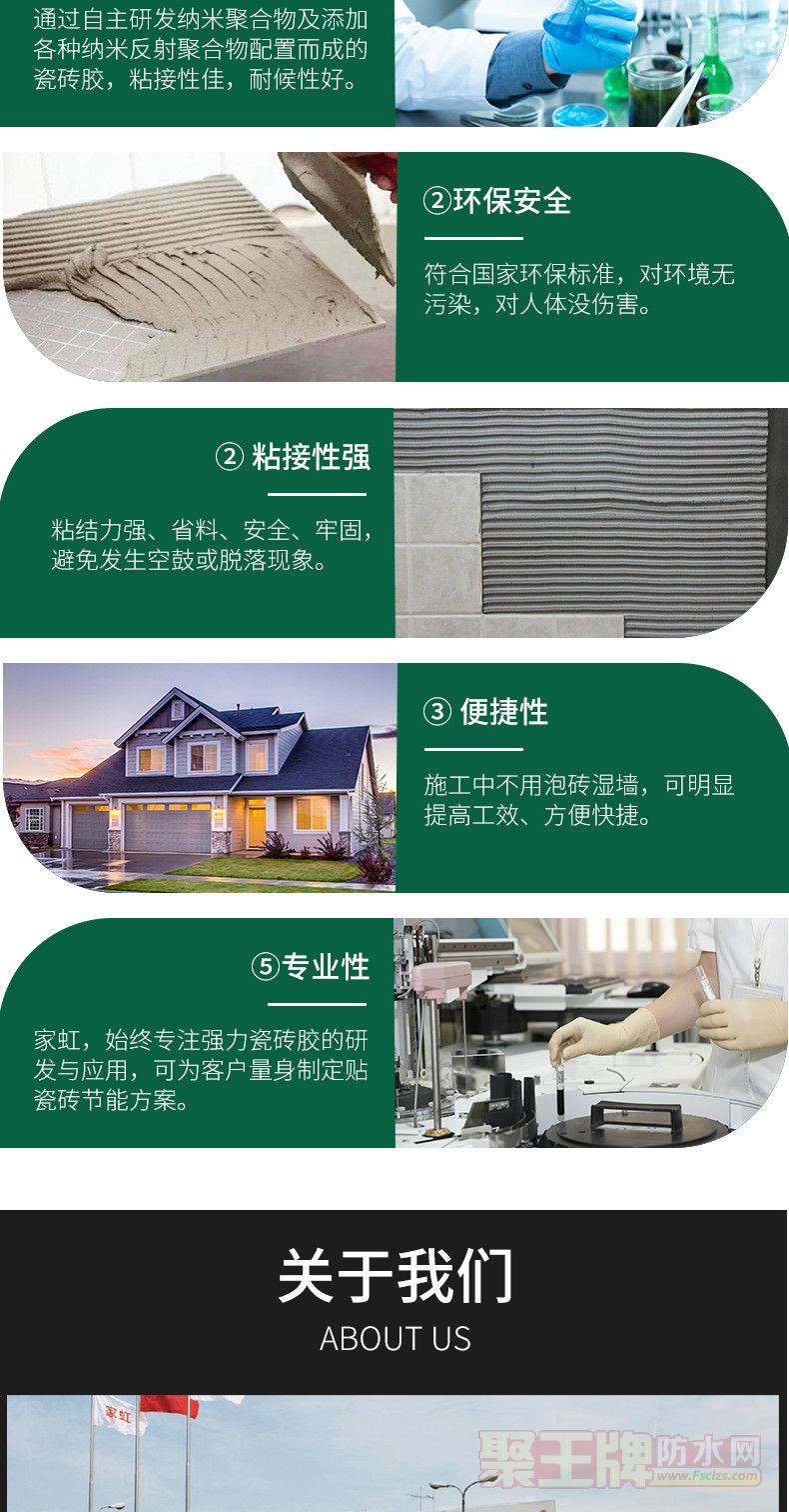 家虹拥有丰富的产品线,包括:防水、密封胶、填缝料、瓷砖胶、腻子、保温砂浆、 地坪王、石材清洗剂、石材保护剂等九大系列产品一百多个品种