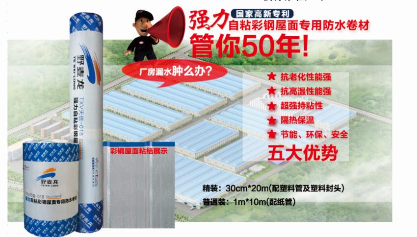 采用特殊的化学共混改性沥青为基料,提高自粘卷材的粘结性能和耐高温性能。高温指标达100℃,粘结强度较普通自粘卷材提高80%。并以金属铝箔为覆面,提高了隔热、抗老化、防水一体化,大大延长彩钢瓦的使用寿命和彩钢屋面防水难题。
