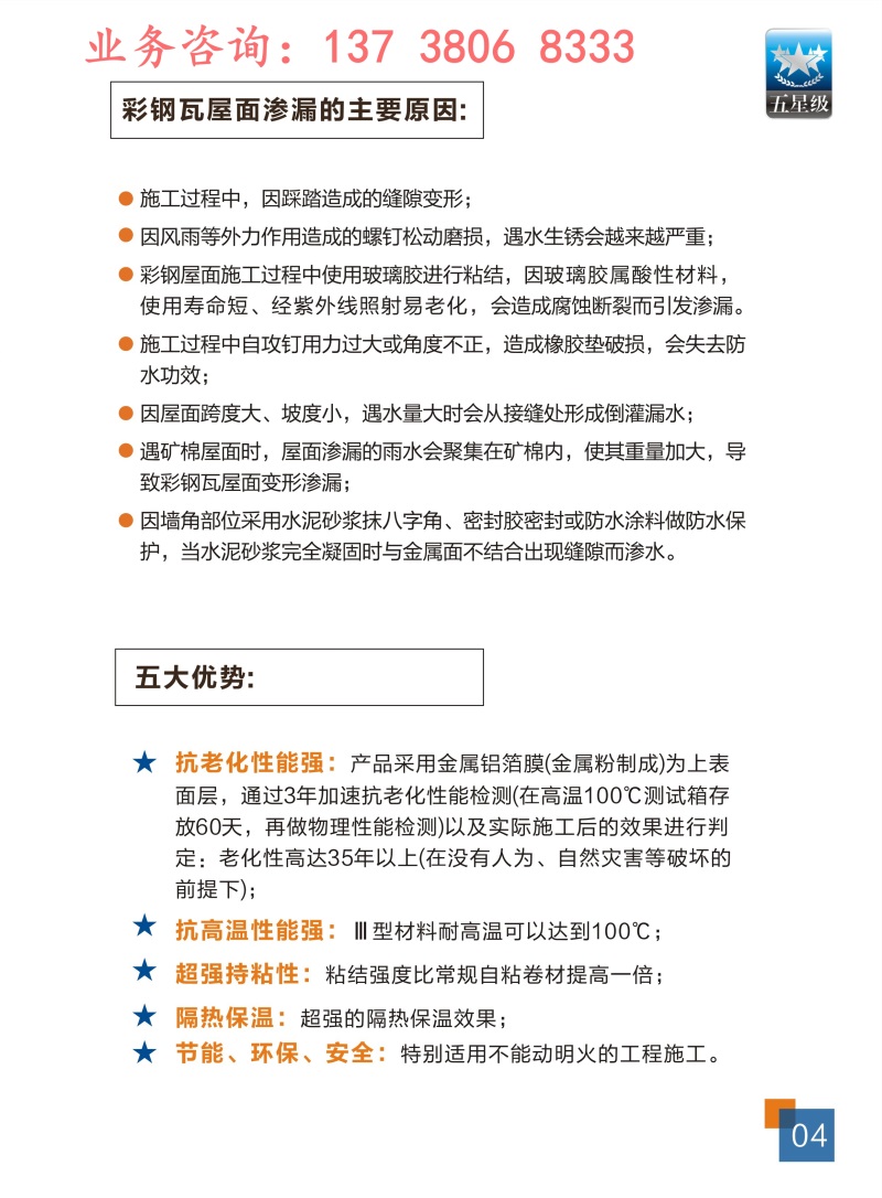 采用特殊的化学共混改性沥青为基料,提高自粘卷材的粘结性能和耐高温性能。高温指标达100℃,粘结强度较普通自粘卷材提高80%。并以金属铝箔为覆面,提高了隔热、抗老化、防水一体化,大大延长彩钢瓦的使用寿命和彩钢屋面防水难题。