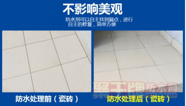 卫生间隐形修补剂是根据地板砖渗透漏水特性研制的一种不刨不砸地板砖,防止已铺地板砖渗漏水的高科技高效新型防水材料,绿色环保,一次防水,终生补漏。卫生间隐形修补剂产品由大小包料两组份组成,该产品利用新型化工科技,能能以水为载体,快速渗入到所有水能渗透的缝隙,并发生固化膨胀反应。凝固后形成一种耐酸碱;耐腐蚀;高柔韧性的不透水胶体,从而堵塞漏水通道。彻底根治地板砖渗透漏水、外墙墙根起潮、起碱、脱落等卫生间漏水问题。