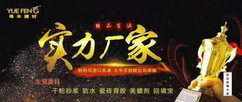 广东粤丰建材有限公司是一家集生产、研发、销售、代工为一体的大型水性环保涂料生产厂家,公司从2007年开始,历经了四次厂房扩大的搬迁,从广州到佛山,从佛山到肇庆,从开始的几百平方到现在占地30多亩的大型生产基地,拥有全自动的乳液生产线6个20吨罐,满足各地客户的大量需求。2条全自动干粉砂浆生产线,日产量为200多吨,美缝生产线5条,合作单位有防水龙头企业上市公司,有油漆涂料巨头公司等。公司以品质为已任,競競业业,敢为天下先,做好每一个产品。