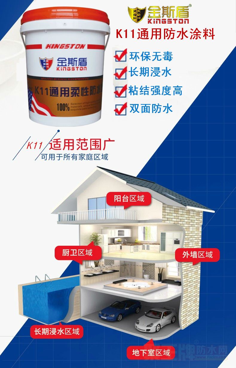 金斯盾K11通用型防水涂料是一种双组分聚合物改性水泥防水材料。浆料由进口高聚物添加各种助剂化合而成,具有高粘结力、柔韧性,以及防 霉、耐磨性能;粉料由优质水泥、石英砂及独特的活性物质组成,遇水之后,发生化学反应,渗进结构体内部,并形成结晶体,不仅阻遏各方向的水 通过,而且加固了结构体,延长其寿命。