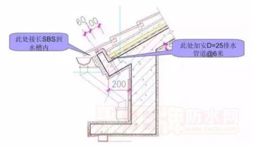 在沿口板上找补一层防水沙浆,使板高于沿口水槽;再铺一层卷材,并在沿口板的防水上,6米左右安装D=25的PVC水管排水,做好上部防水(见上图);
