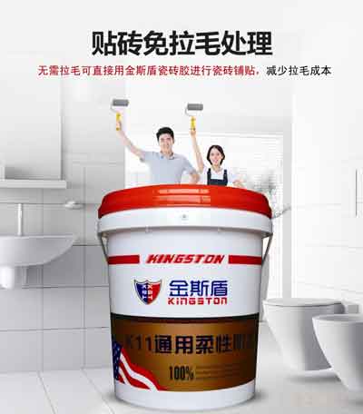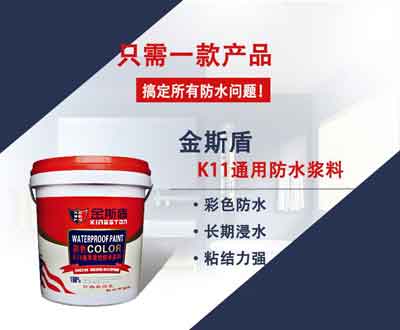 金斯盾K11通用型防水涂料是一种双组分聚合物改性水泥防水材料。浆料由进口高聚物添加各种助剂化合而成,具有高粘结力、柔韧性,以及防 霉、耐磨性能;粉料由优质水泥、石英砂及独特的活性物质组成,遇水之后,发生化学反应,渗进结构体内部,并形成结晶体,不仅阻遏各方向的水 通过,而且加固了结构体,延长其寿命。