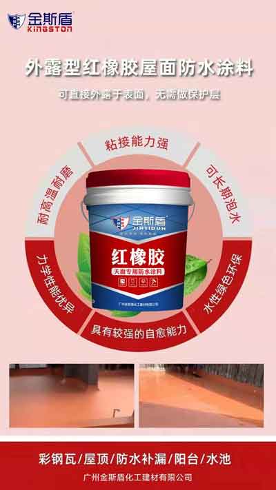 金斯盾红橡胶防水是以橡胶乳液为基料,配以高档进口树脂乳液、助剂及填充料精制而成的一款橡胶防水补漏涂料。它具有优异的粘性和弹性功能, 环保无污染、单组份易施工。施工完成后更不容易因天面昼夜温差变化导致材料开裂,因此补漏效果更持久性,可应用于天面、地下室、隧道、外墙 及金属屋面等场景的防水处理。