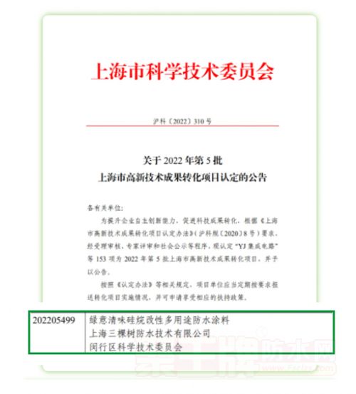 三棵树防水硅烷改性多用途防水涂料荣获《2022年第5批上海市高新技术成果转化项目认定》